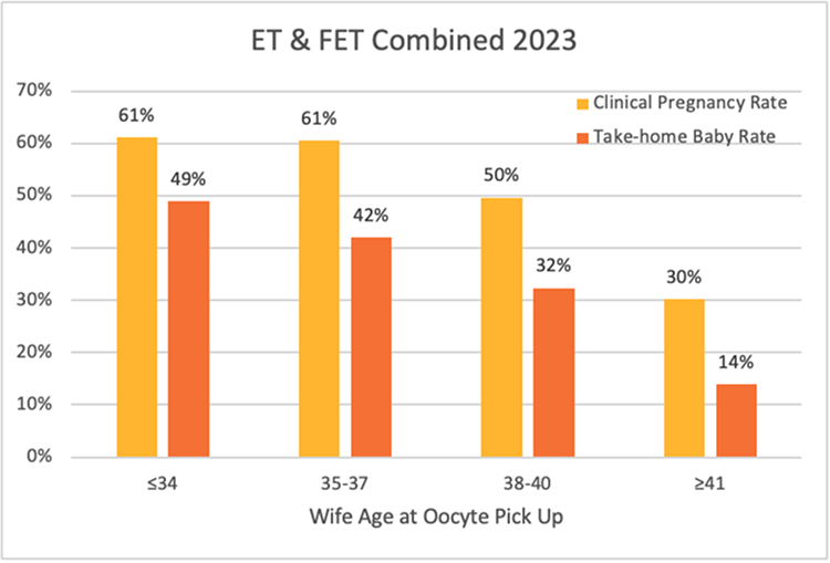 In 2023, the overall take-home baby rate of ET and FET in our centre was 39%. The take-home baby rate of ET and FET of different age groups is as follows.