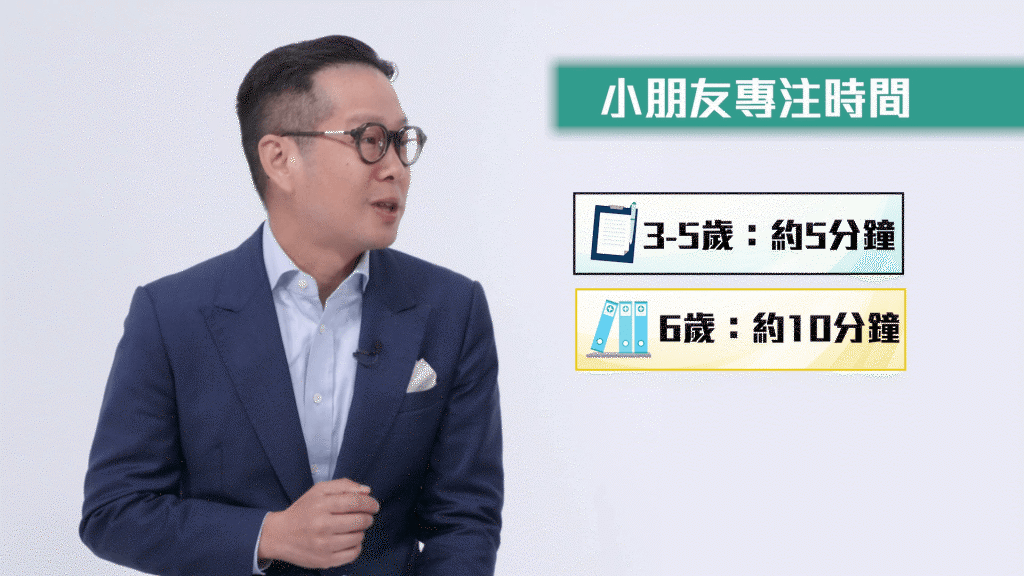 黃沛霖博士指出家長要了解小朋友坐不定,不代表一定有ADHD,例如3至5歲小朋友的專注時間大約只有5分鐘,一年班的小朋友大約只可專注10分鐘,所以如果小朋友比較活躍,不用太早擔心,但觀察一段時間後仍懷疑小朋友有ADHD的問題,就需要做評估。