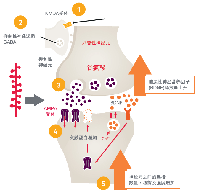 谷氨酸(glutamate)为中枢神经系统中主要的兴奋性神经递质,在大脑一半以上的神经元连接中担当着重要角色。近年研究发现,抑郁症患者的谷氨酸讯号传递出现异常,令大脑中部份关键区域的神经元之间大脑的连接量和强度下降,继而影响情绪控制。透过阻断一种称为NMDA受体的谷氨酸受体,相信能增加谷氨酸释放,改善脑神经元之间的连接表现。研究亦显示,在使用谷氨酸受体调节剂后24小时内,大脑神经元之间的连接数量有所增加和强度提升。