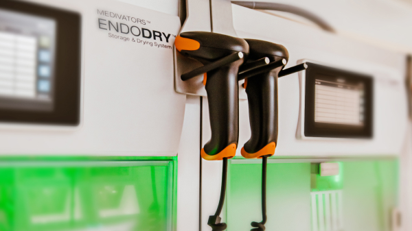 After processing, endoscopes are stored in ENDODRYTM Endoscopy Storage and Drying System which continuously forces filtered air through all endoscope channels, ensuring complete dryness of endoscopes and preventing bacterial growth.